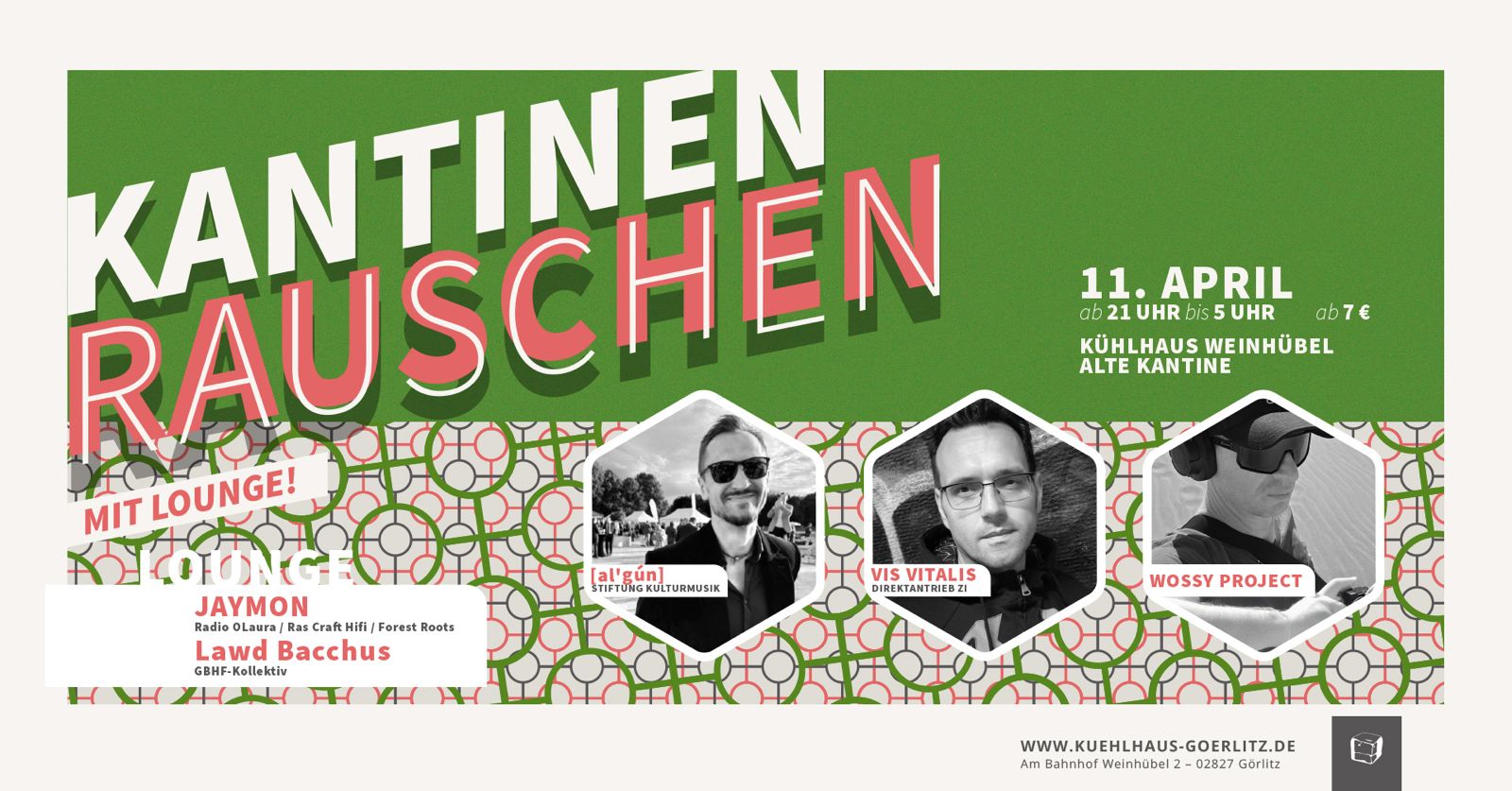 Kantinenrauschen im April Einlass: ab 21 Uhr Eintritt: ab 7 € Mit Musik von: al'gún Vis Vitalis Wossy Project Lounge: Ja...